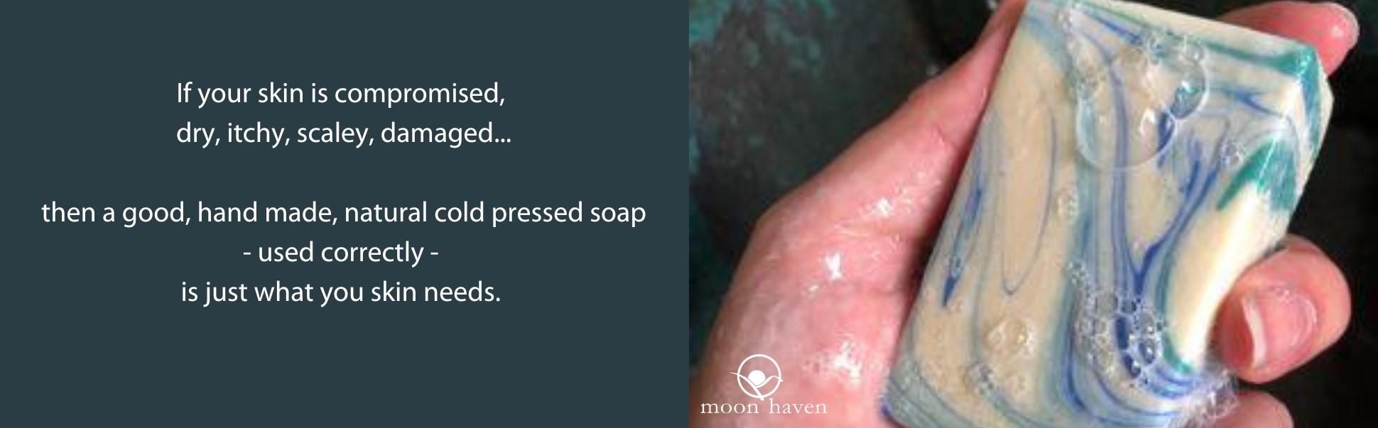 You see, if your skin is compromised, dry, itchy, scaly damaged... then a good, hand made, natural cold pressed soap - used correctly-  is just what you skin needs.