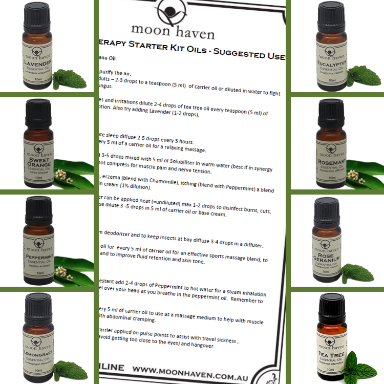 Formulated by Leonie, Moon Haven's aromatherapist,  suggested uses for each pf the 8 essential oils in Moon Haven's Aromatherapy Starter Kit.